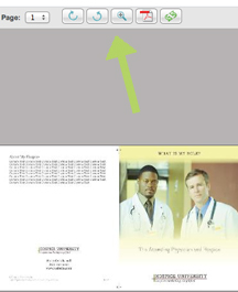 6. There are tools to preview the brochure above the picture of the brochure. Use the “Page” dropdown button to choose page 1 or 2. Use the circular arrow buttons to rotate the image. Use the magnifying glass to enlarge the image. Use the Adobe button to see a PDF preview. The green arrows will refresh the image.