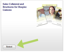 2. When ordering a brochure or rack card, choose the “Sales Collateral and Brochures for Hospice Liaisons” category by clicking the ‘select’ button.