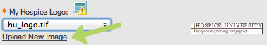 9. Next, upload your hospice’s logo. Click the ‘Upload New Image’ link. Your logo should be a print quality image, at least 300 dpi. The file format must be JPG, JPEG, PDF, TIF, TIFF, PS, or EPS. Once uploaded, it will update in the brochure preview.